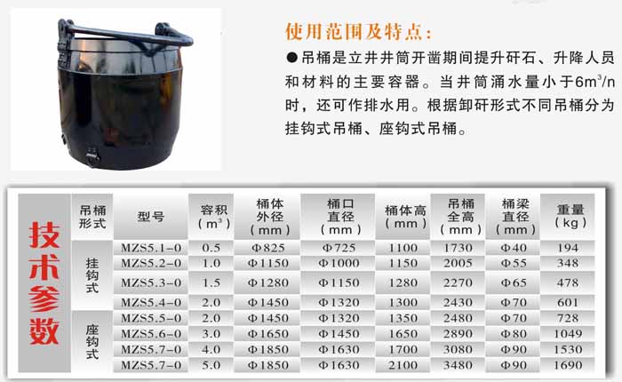 - 吊桶,根據(jù)卸矸形式不同那,可分為掛鉤式吊桶和座鉤式吊桶。而吊桶是立井井筒開鑿期間提升矸石,升降人員和材料的主要容器。并且,當(dāng)井筒涌水量小于/h時,還可作排水用。非常方便,簡單易操作。使用范圍及特點(diǎn):吊桶是立井井筒開鑿期間提升矸石、升降人員和材料的主要容器。當(dāng)井筒涌水量小于6M3/h時,還可作排水用。根據(jù)卸矸形式不同吊桶分為掛。鉤式吊桶、座鉤式吊桶座鉤式吊桶的用途:吊桶是立井井筒開鑿期間提升矸 石、升降人員和材料的主要容器。當(dāng)井筒涌水量小于6M3/h時,還可作排水用。座鉤式吊桶是礦山立井施工中用于運(yùn)送混凝土的專用設(shè)備,它適用于煤礦、金屬礦、非金屬礦及其他立井施工需要澆注混凝土的場合。座鉤式吊桶特別對用凍結(jié)施工深表土層時、不能使用輸料管下料時,更適合,座鉤式吊桶是煤礦鑿井期間安全生產(chǎn)必不可少的。舊式底卸式吊桶在使用過程中顯得笨拙,操作不方便,卸料不完全等缺點(diǎn)。本產(chǎn)品在原有的技術(shù)上改革創(chuàng)新,擺脫了這些缺點(diǎn),提高了輸送混凝土的速度,操作簡便,在出料口的弧行板面設(shè)有橡膠板,保證了出料口部的密封性和漿液不泄露,同時也延長了吊桶的使用壽命,對避免和防止在煤礦立井期間不安全的隱患發(fā)生有著十分重要的意義,因此將該項技術(shù)推廠應(yīng)用,順應(yīng)煤礦安全生產(chǎn)和發(fā)展的趨勢和需求。結(jié)構(gòu) 兩種型式的吊桶的結(jié)構(gòu)均如下圖所示,不同的是掛鉤式吊桶是平底,座鉤式吊桶如下圖右下角所示是雙層桶底結(jié)構(gòu)。另外,3m3以下型號桶梁無圖示之支撐。座鉤式吊桶輸送混凝土的優(yōu)點(diǎn)是:1、卸料快,操作簡便。2、安全可靠。3混凝土的水灰比能得以充分保證。比用管道輸送的優(yōu)點(diǎn)是無離析現(xiàn)象。4、在完成一個段高的砌壁工作后,工作面清理工作量小,從而砌壁速度快。5、矸石吊桶在翻轉(zhuǎn)卸料時對吊盤沖擊大,底卸式吊桶則無此弊端,且不須在吊盤上設(shè)專人司摘掛鉤工作,因而能節(jié)省人時。6、能適應(yīng)各種砌壁工藝。座鉤式吊桶需要配鉤頭裝置使用,礦用吊桶是立井井筒開鑿期間提升矸石、升降人員和材料的主要容器。座鉤式吊桶應(yīng)用要求1. 使用前應(yīng)檢查銷軸的螺母及開口銷是否松動損壞脫落、銷軸桶梁轉(zhuǎn)動處是否銹蝕、轉(zhuǎn)動是否靈活,有缺件及時更換。使用時各轉(zhuǎn)動處應(yīng)加油潤滑,避免零件之間的干磨損。2.座鉤式吊桶桶體上的四個鉤環(huán),主要供提升時穩(wěn)定、移動及更換吊桶時操作之用。3. 桶梁掛鉤處磨損量達(dá)到下列情況時,建議更換: ⑴ 容積4m³以上(含4m³)吊桶桶梁磨損量小于垂直方向設(shè)計直徑10mm時;⑵ 3m³以下(含3m³)的吊桶桶梁磨損量小于垂直方向設(shè)計直徑12%時。4. 使用期間應(yīng)有專人對桶梁、銷軸、耳環(huán)、鉚釘、焊縫進(jìn)行檢查。5.座鉤式吊桶適用于自動翻矸裝置。座鉤式吊桶的桶底是雙層桶底,桶底中間有中心圓孔,是為自動翻矸時與鉤子配合所用,吊桶規(guī)格不同,雙層桶底中心孔幾何尺寸也不同,使用時只需參照吊桶圖樣式對自動翻矸裝置的托架寬度與支撐高度加以修改即可。掛鉤式吊桶無雙層桶底,適用于人工掛鉤翻矸.6. 為防止桶梁砸手,應(yīng)在桶梁落腳的桶口處焊上四個桶梁支撐板塊。座鉤式吊桶保養(yǎng)、維修用戶應(yīng)定期檢查桶梁耳柄、內(nèi)外耳環(huán)板孔壁、桶梁掛鉤段圓弧、銷軸軸頸等處的潤滑及磨損情況,經(jīng)常處于干摩擦狀態(tài)時會加劇磨損,當(dāng)磨損量達(dá)到第五條中的相關(guān)規(guī)定時,建議更換。當(dāng)桶體壁凹凸不平嚴(yán)重、彎曲變形、銹蝕嚴(yán)重、桶壁減薄、局部焊縫開裂,應(yīng)進(jìn)行檢修再用。貯存半年以上,使用前進(jìn)行檢查、保養(yǎng)。
