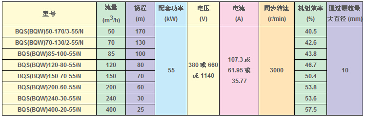 1、BQS(W)55KW的礦用隔爆型排污排沙潛水電泵的結(jié)構(gòu)上部為隔爆型潛水排沙電泵用電動機,中部為機械密封,下部為水泵,電動機與機械密封及水泵同軸連接組成。
