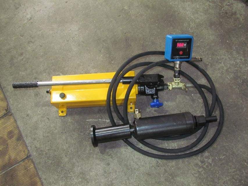 4、將手動(dòng)液壓泵上缷載閥擰緊,然后均勻地上下?lián)u動(dòng)手動(dòng)液壓泵桿,使空心千斤頂拉桿頂出并拉拔錨桿,當(dāng)拉拔力達(dá)到要測(cè)數(shù)值后停止加壓。