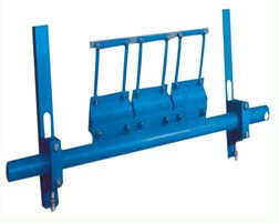 TQII型雙排重錘清掃器安裝于頭部,卸料滾筒處,清掃輸送帶工作面上粘附物料。