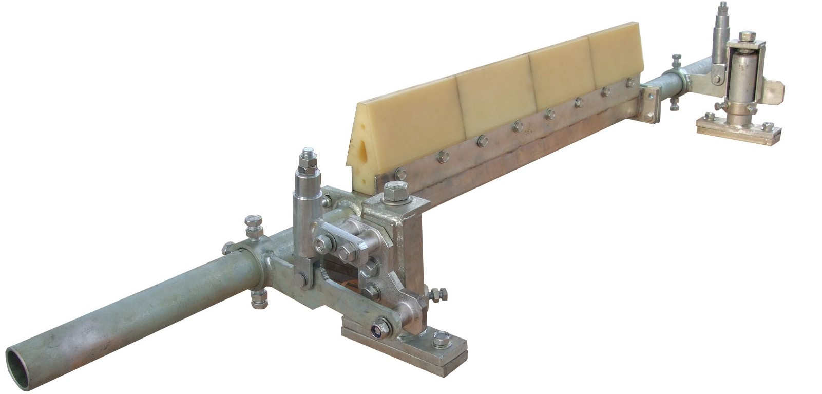 合金橡膠清掃器簡稱合金清掃器,合金清掃器與皮帶接觸的是合金刮刀,靠合金刮刀清除粘附物料。合金刮刀下是橡膠體,起到緩沖作用。合金清掃器目前仍是主要的皮帶機(jī)清掃器。